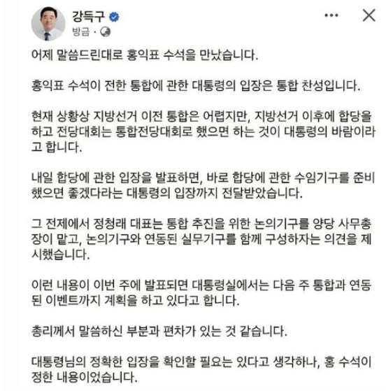 강 의원은 10일 조국혁신당과 합당 여부를 결정할 최고위원회의 전에 "홍익표 청와대 정무수석과 만났고, 홍 수석이 전한 대통령 입장은 ’통합 찬성’"이라고 적었다.