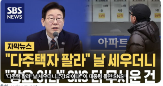 이 대통령은 14일 X(트윗)에 < '다주택 팔라' 날 세우더니…'강요 아냐' 이 대통령 돌연 SNS> 제목의 SBS 유튜브 영상 섬네일을 공유하며 "나는 직설적으로 날을 세우거나 매각을 강요한 적도 없고 그럴 생각도 없는데 왜 이런 식으로 보도하느냐"고 말했다.