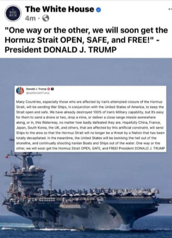 “어떤 방법이든 간에, 우리는 곧 호르무즈 해협을 개방되고, 안전하며, 자유로운 상태로 만들 것이다!”