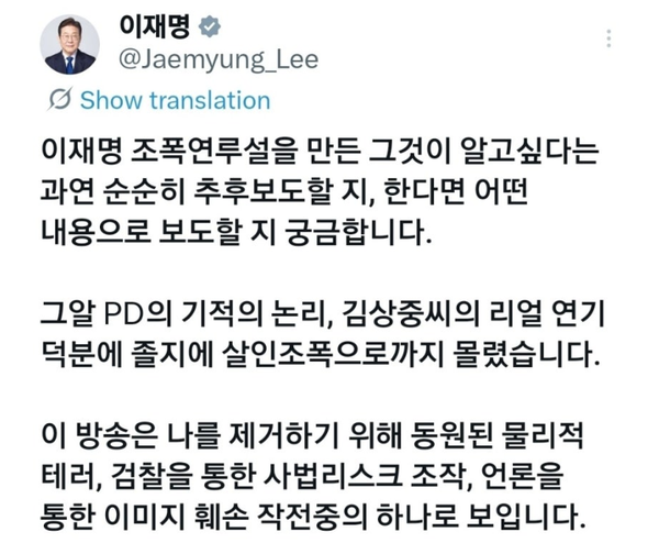 이 대통령은 "그알 PD의 기적의 논리, (프로그램 진행자) 김상중 씨의 '리얼 연기' 덕분에 졸지에 '살인 조폭'으로까지 몰렸다"며 "이 방송은 나를 제거하기 위해 동원된 물리적 테러, 검찰을 통한 사법 리스크 조작, 언론을 통한 이미지 훼손 작전 중 하나로 보인다"고 말했다.