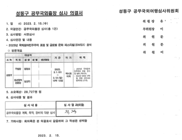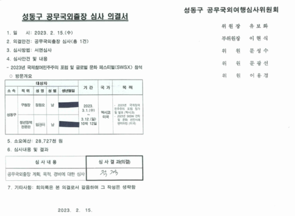 김 의원은 "제가 제보자로부터 받은 ‘공무출장 심사의결서’에는 해당 직원의 성별이 ‘남성’으로 조작돼 있었다”며 “구체적인 자료를 요청하자 성동구청은 성별 항목을 가려서 제출했다"고 말했다.