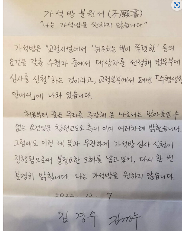 김 전 지사는 불원서에서 “가석방은 교정시설에서 '뉘우치는 빛이 뚜렷한' 등의 요건을 갖춘 수형자 중 대상자를 선정해 법무부에 심사를 신청하는 것이라고 교정본부 '수형생활 안내서'에 나와 있다"며 "처음부터 줄곧 무죄를 주장해온 나로서는 받아들일 수 없는 문건임을 창원교도소에 이미 여러 차례 밝혔다. 그럼에도 이런 제 뜻과 무관하게 가석방 심사 신청이 진행됨으로써 불필요한 오해를 낳고 있다"고 주장했다.