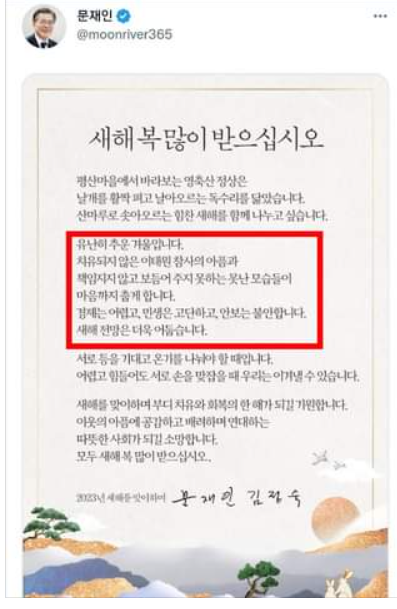 문재인 전 대통령이 30일 SNS)에 공개한 신년 연하장에서 “치유되지 않은 이태원 참사의 아픔과 책임지지 않고 보듬어주지 못하는 못난 모습들이 마음까지 춥게 한다”며 “경제는 어렵고, 민생은 고단하고, 안보는 불안하며 새해 전망은 더욱 어둡다”라고 했다.
