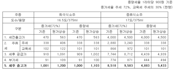 최근 돌풍을 일으키고 있는 ‘프리미엄 소주’(증류식 소주)의 경우 원가 상승분이 희석식 소주보다 더 클 수밖에 없음에도 ‘종량세’가 적용되면 약 3천 원이 낮아질 수있다.